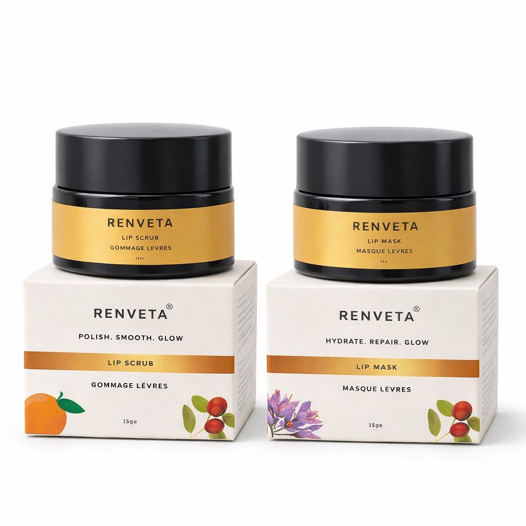 RENVETA Lip Ritual is a thoughtfully crafted Ayurvedic lip care duo made with clean, natural ingredients that nurture your lips without compromising your body’s internal balance. Every ingredient is chosen with care—gentle, non-toxic, and free from harsh chemicals—so what touches your lips remains safe.